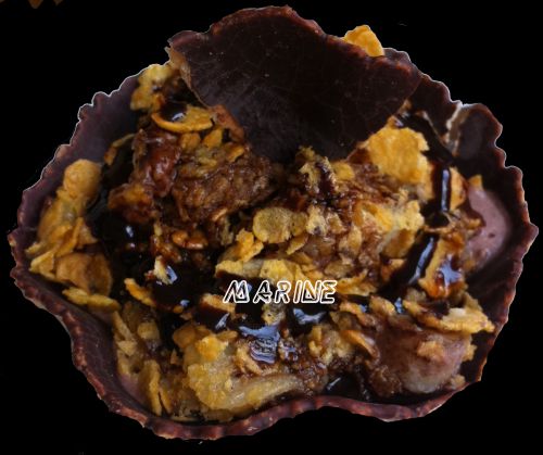 Couper la banane en rondelles, la faire cuire au beurre, une fois cuit, les roulées dans le maïs puis mettre tous les morceaux dans la coupelle, napper de chocolat. Mettre au frigo, servir bien froid.