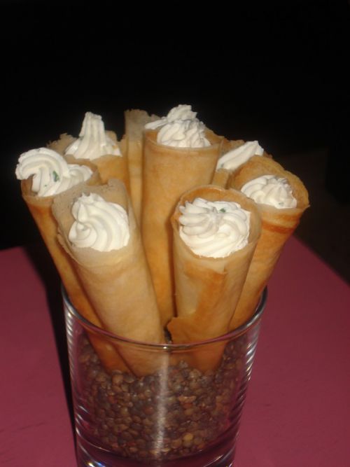 2h avant de servir faire des conne de pate feuilletée avec des moules a conne 20 mins au four environ, démouler , laisser refroidir puis mettre la crème de chèvre