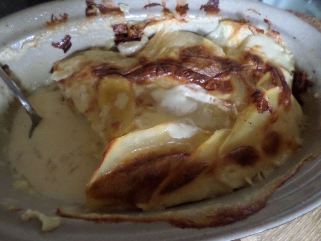 mettre le lait a ébullition , puis y mettre les pommes de terre , en remuant régulièrement pendant 10 bonne minutes, mettre enfin dans une terrine ( je dis une terrine car un moule a lasagne est trop bas donc cela va dessécher durant la cuisson) le contenu entier du fait tout puis enfin recouvrir de crème liquide
