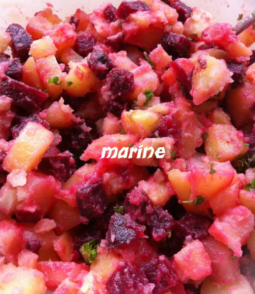 faire cuire les pommes de terre a l’eau salée une fois pelées, une fois cuite et refroidie la couper en cube puis la mettre dans un saladier , couper en cube la betterave également, attention ,( bien juteux et très tachant )la mettre avec les pommes de terre , verser de la vinaigrette, bien mélanger , délicatement en y ajoutant le persil finement couper , servir bien frais. Plusieurs bloggeurs me l’on également conseiller avec de la mayo a la place de la vinaigrette (perso jamais testée mais pourquoi pas )