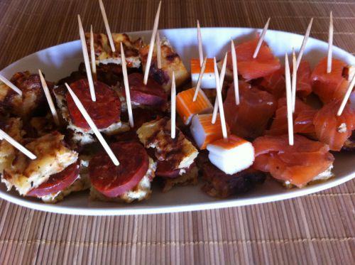 Y déposer dessus, des tranches de chorizo, ou de surimi, ou de saumon fume puis mettre un pique, conservé au frigo avant dégustation