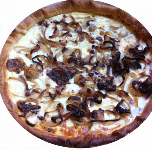 Couper en rondelles les tomates et la buche de chèvre, mettre les tomates, le chèvre, puis enfin les oignons réduit.